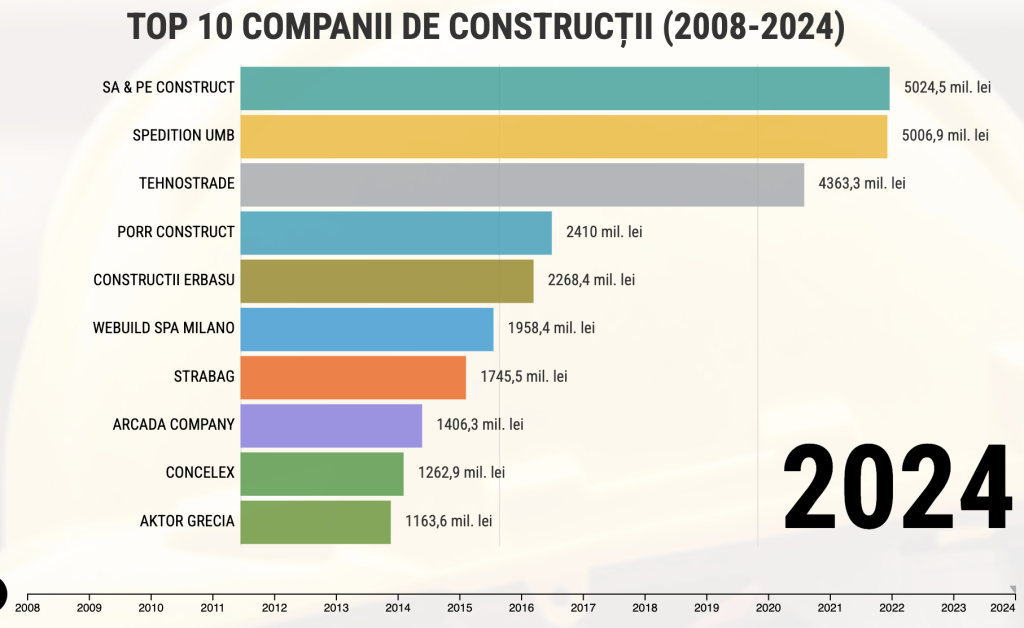 Pe prima poziţie se situează SA&PE Construct SRL (controlată de familia Umbrărescu), cu o cifră de afaceri de 5,02 miliarde lei şi un profit net de 229,1 milioane lei în 2024, în creştere cu circa 237% faţă de anul precedent. Pe locul al doilea apare Spedition UMB SRL tot din grupul Umbrărescu, cu afaceri de 5 miliarde lei şi profit net de 81,8 milioane lei. Pe locul trei a fost situată Tehnostrade SRL, cu cifră de afaceri de 4,36 miliarde lei şi profit net de 417,4 milioane lei.